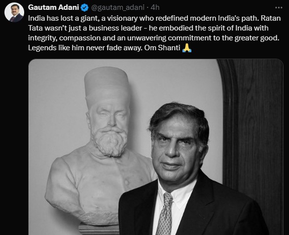 'India has lost a great and visionary man who redefined the path of modern India. Tata was not just a business leader, he embodied the spirit of India with integrity, compassion and an unwavering commitment to the greater good. Great men like him never disappear. Om Shanti'