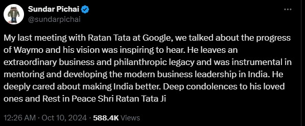 In my last meeting at Google with Ratan Tata, we talked about Waymo's progress and it was inspiring to hear his vision. He leaves an extraordinary business and philanthropic legacy. He has played an important role in developing modern business leadership in India. Deepest condolences to his loved ones and may Shri Ratan Tata rest in peace.