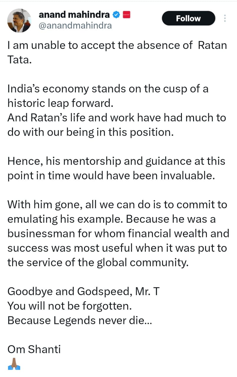 Industrialist Anand Mahindra said- 'I am not able to accept the absence of Ratan Tata. India's economy stands on the cusp of a historic leap. And Ratan's life and work have contributed a lot in our remaining in this position.