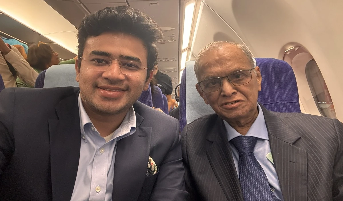 BJP MP Tejashwi Surya referred to a two-hour conversation with Infosys co-founder Narayan Murthy during the air journey. He discussed the future, leadership and various regions of India, while the BJP MP jokingly mentioned the statue's 70 -hour work statement. Sharing a picture of this air travel meeting, BJP MP Surya wrote in a post on X that while returning to Bangalore from Mumbai today, there was an inspirational conversation with veteran Narayan Murthy. Narayan Murthy played a leading role in the Indian IT service sector and made it a global superpower. He created property for millions of middle class families through Infosys.
