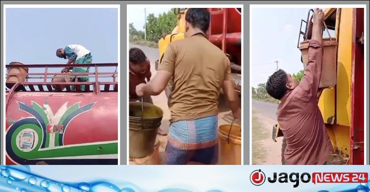 In the video, a fuel oil tanker with registration number Chuadanga-T0-0003 is seen parked on the side of the highway. A man on top of a lorry is unloading oil with a bucket and a shopkeeper named Ali Hossain standing below is taking the oil to his shop. The shopkeeper identified himself when asked by the journalist, but the person on the lorry refused to give his name.